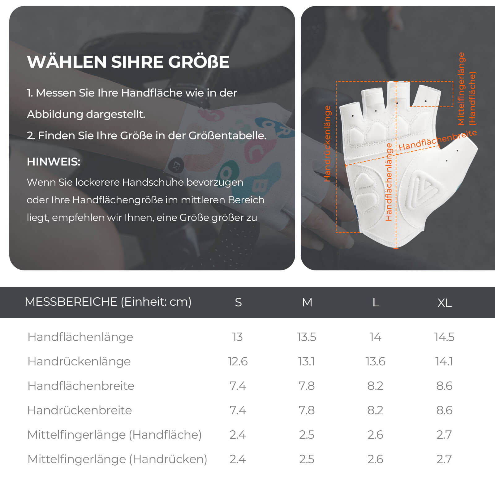 4. EXAKT STORLEKSVAL BASERAT PÅ HANDFLATSMÅTT En tydlig storlekstabell säkerställer perfekt passform genom att mäta din handflata. Proffstips: För medelstora händer, välj en storlek större för en lösare passform. 5. ANDNINGSBARA OCH SKAVFRIA FÖR LÄNGRE ANVÄNDNING En speciell materialkomposition garanterar optimal luftcirkulation. Sömlös konstruktion eliminerar skavpunkter – perfekt för turer i flera timmar.