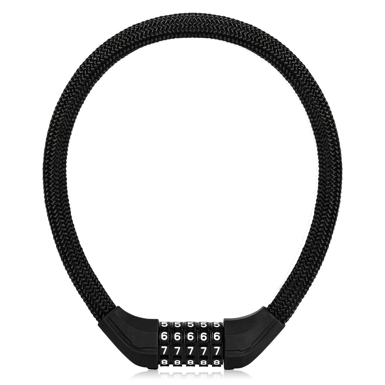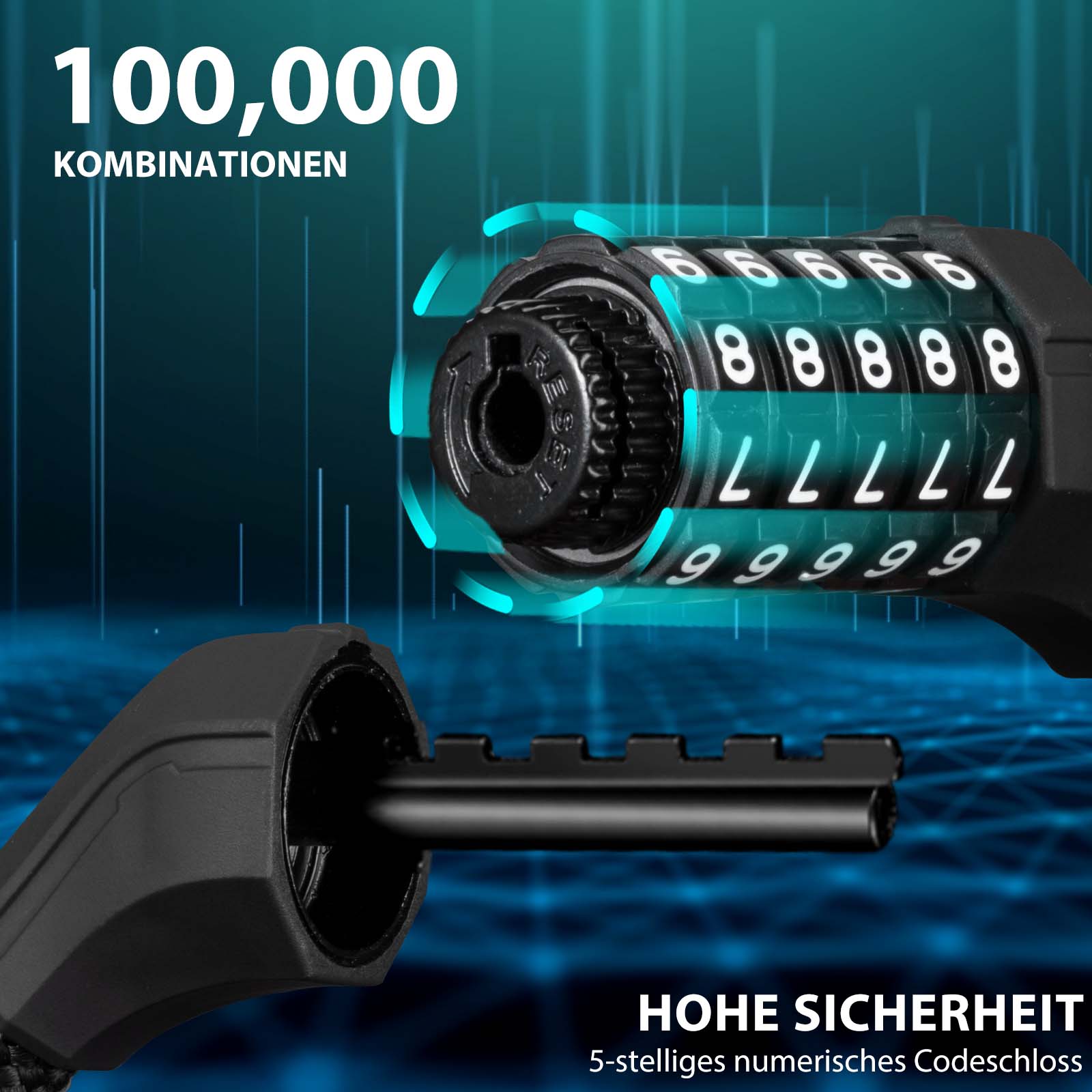 - 5-siffrigt lösenord: Med sin 5-siffriga kod (totalt 100 000 möjliga kombinationer) erbjuder cykellåset enastående stöldskydd. Oroa dig inte för att du inte kan öppna låset på grund av en borttappad nyckel.