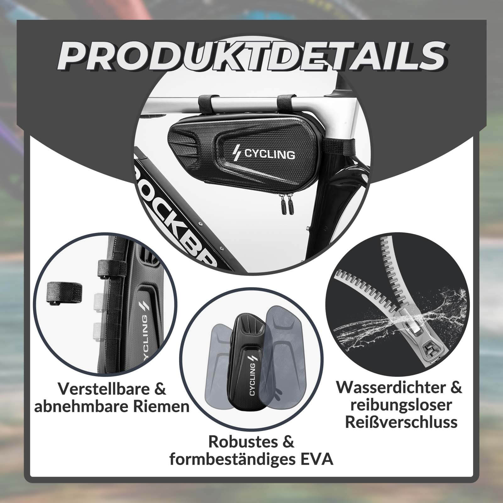 Det yttre materialet i denna triangulära cykelväska är av högkvalitativ EVA. Våra ramväskor är extremt hållbara, slitstarka och formstabila, vilket ger utmärkt skydd för dina tillhörigheter.