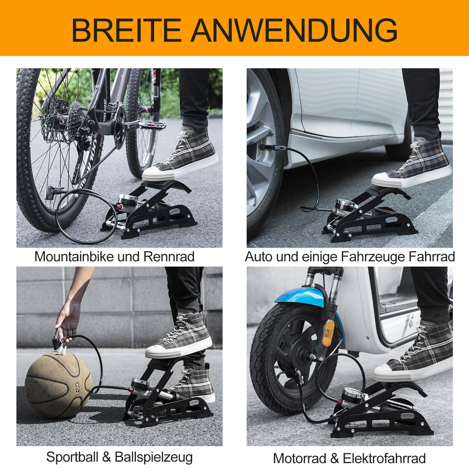 - Solid konstruktion: Den avtagbara gummislangen är frostsäker och värmebeständig och cirka 30 cm lång. Den bredare pedalen har en halkfri design för att förhindra glidning vid pumpning.